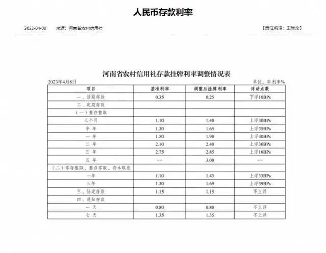 4月8日,河南省農(nóng)村信用社發(fā)布關于調(diào)整人民幣存款利率的公告顯示,自4月8日起,活期存款掛牌利率為0.25%,將一年期、兩年期、三年期整存整取定期存款掛牌利率分別調(diào)整至1.9%、2.4%、2.85%。